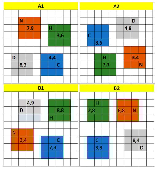 Layout of the blocks showing randomized locations of subplots. “C” = control treatment, “D” = digestate treatment, “N” = urea treatment, “H” = hydrochar treatment. Blocks A1 and A2 are located in site A while blocks B1 and B2 are located in site B. Numbers separated by commas indicate coordinates (m) of soil collar measured from the southeast corner of the plot.