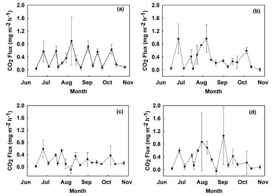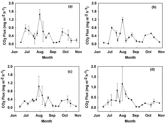 Time series CO2 fluxes measured from June to October 2018 at site B in mg m−2 h−1 by treatment: (a) control, (b) digestate, (c) hydrochar, (d) urea. Values show a mean across two replicated plots with error bars representing the standard error.