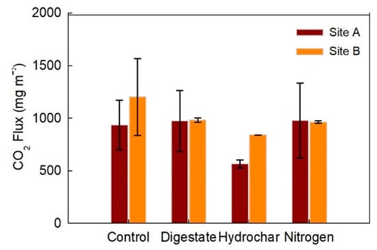 Cumulative CO2 fluxes in mg m−2 from subplots in sites A and B treated with digestate, hydrochar, urea (nitrogen), and control treatments from June–October 2018. Values are a mean of two replicated plots with error bars representing the standard error.