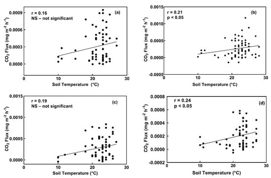 CO2 fluxes vs. soil temperature at 10 cm in control treatment plots (a), and plots treated with urea (b), digestate (c), and hydrochar (d).
