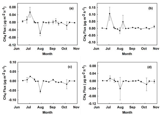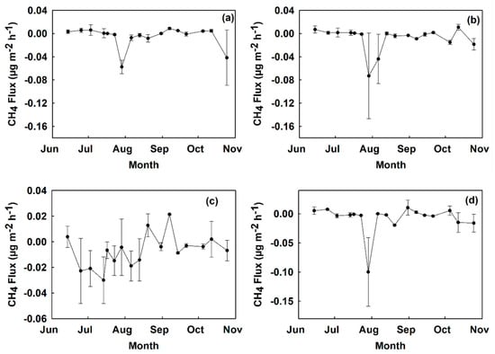Time series CH4 fluxes measured from June to October 2018 at site B in µg CH4 m−2 h−1 by treatment: (a) control, (b) digestate, (c) hydrochar, and (d) urea. Values show a mean across two replicated plots with error bars representing the standard error.