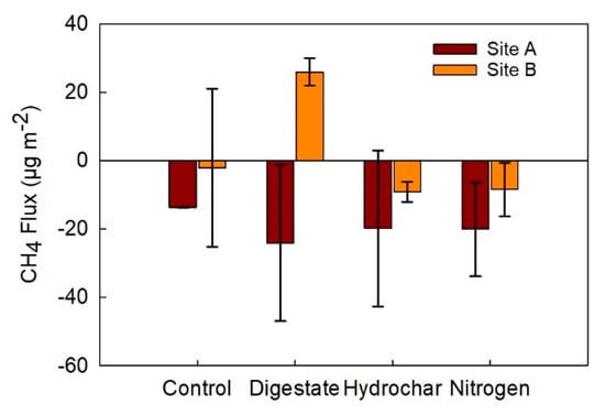 All plots became a sink of CH4 on 29 July (Figure 6 and Figure 7). The lowest absolute fluxes occurred during the months of September and October. Total cumulative CH4 fluxes over the period of the study at site A were −24.2 µg CH4 m−2 in digestate, −13.7 µg CH4 m−2 in control, −20.1 µg CH4 m−2 in urea, and −19.9 µg CH4 m−2 in hydrochar treated plots. The total cumulative CH4 flux over the period of the study at site B was 25.9 µg CH4 m−2 in digestate, −2.13 µg CH4 m−2 in control, −8.49 µg CH4 m−2 in urea, and −9.17 µg CH4 m−2 in hydrochar treated plots (Figure 8).