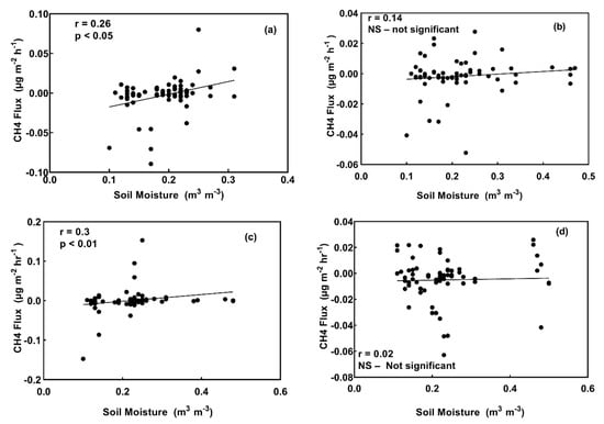 CH4 fluxes vs. soil temperature at 10 cm in control treatment plots (a), and plots treated with urea (b), digestate (c), and hydrochar (d).