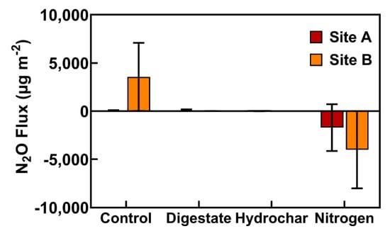 Out of the 17 weeks of sampling, fluxes of N2O in the hydrochar treatment plots were detected on only five sampling weeks at site A, and these all showed the soils acted as a small sink on average. There was no N2O flux recorded at site B for hydrochar-treated soils. Generally, studies investigating the effects of hydrochar on N2O emissions report a reduction in N2O emissions [36,37,50,54]. Kammann et al. [36] however observed a subsequent increase in N2O emissions of 302%. Hydrothermal carbonization usually results in an increase in the C of the material that was pretreated resulting in an increase in C content of soil when used as an amendment [3]. Higher C:N ratios (17:1 in the case of hydrochar used in this study) are correlated with higher immobilization of organic N in soil, which reduces mineralization and nitrification. This likely led to the suppression of denitrification in hydrochar-treated soils.