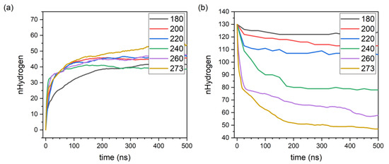 Form our previous study, the melting temperatures of T propane/hydrogen-clathrate surfaces were expected to be around 280 K [17]. The evolution in the number of hydrogen uptaken into/released from the propane hydrate was judged via the Báez–Clancy criteria, is specified in Figure 3 for both release and uptake at 180, 200, 220, 240, 260 and 273 K. Due to the observed slow kinetics of the uptake simulation, the simulation for hydrogen uptake extended up to 5 µs while for the case of release study a kind of plateau was observed after 500 ns. The rate constant of the gas uptake/release correlates directly with the simulation temperate as the thermal “driving forces” for gas diffusion.