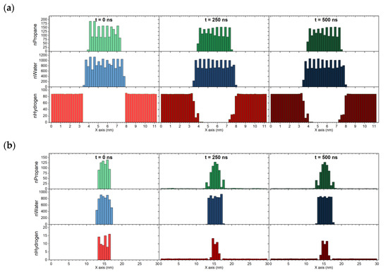 Density map of propane, water, and hydrogen molecules along the X-axis for uptake (a) and release (b).