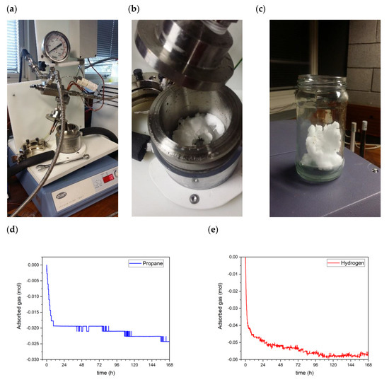 (a) High-pressure apparatus used for hydrogen growth and hydrogen storage study, (b,c) the formed hydrate immediate after pressure release and opening the reactor, (d) Number of propane moles adsorbed during the formation of the hydrate in the first 7 days under 4 bar pressure of propane, (e) Number of hydrogen moles adsorbed during the storage step in the second 7 days under 25 bar pressure of hydrogen at 1.5 °C.
