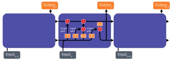 It needs to be noted that very early versions of RNNs were incapable of learning long-term dependencies, because these RNNs were unable to form connections between old and new data when a large information gap existed between them []. This resulted in a phenomenon known as vanishing gradient problem, where the error signals vanished during backpropagation, which eventually led to a model breakdown. Hochreiter and Schmidhuber [] developed LSTM to solve the vanishing gradient problem, but Ger et al. [] showed that LSTM was still not able to efficiently learn sequences that were very long or continuous. The reason for this failure was that the internal values of the memory cell in LSTM models had grown out of bound from the continuous input stream, despite the fact that the LSTM model was programmed to reset itself when faced with this kind of problem. As a remedy, “forget gates” were introduced to LSTMs, which remove data that were no longer relevant in memory cells, thereby forgetting and resetting information in memory cells at appropriate times []. Useful information, on the other hand, was continuously backpropagated, thus, allowing these models to memorize relevant information and recognize patterns in long-term dependencies. The architecture of the LSTM model is shown in Figure 3.
