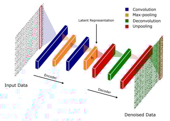 Rumelhart et al. [] were the first to propose Autoencoders (AEs), a DL technique that is specialized in dimensionality reduction and denoising of data. The key player in an autoencoder operation is the latent (hidden) representation, h, as shown in Figure 4. It plays the role of a bottleneck, which retains only those features that are necessary to reconstruct the input data on the AE output []. This latent representation (features) is often used in data classification tasks. This implies that AEs and CNNs have common characteristics and attempt to extract and learn only important features. While CNNs make use of convolutional layers to concentrate the extracted features and improve recognition ability, AEs make use of latent representation (h) to compress the data received from the encoder unit. This step retains salient features and removes irrelevant data. Thus, the operation of AEs includes denoising and reducing the data dimension while extracting features simultaneously. This reduces the computational complexity which in certain classification tasks makes AE models easier to train []. However, AEs are also associated with disadvantages, such as poor data compressibility and the inability to train a model effectively for certain tasks. For instance, the latent representation (h) will fail to capture salient features if errors are present in the encoder unit []. This is because h cannot get rid of errors; instead, it will compute the average of the input data rather than retain salient features for the decoder unit. The goal of AEs is to reconstruct the input data as shown in Figure 4, hence, the encoder units of AEs have to ensure that there are minimum errors before feeding the input data into the latent representation, h.