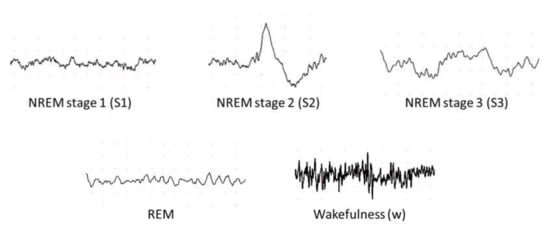 According to Rechtschaffen and Kales (R and K) [], humans can experience six discrete stages during sleep: (1) wakefulness (W), (2) rapid eye movement (REM) sleep, and (3) four stages of non-REM (NREM) sleep (S1 to S4) []. Based on the sleep electroencephalogram (EEG) characteristics, W occurs when the brain is most active, which is represented by high frequency of alpha rhythms. In the NREM sleep, these alpha rhythms eventually diminish when entering the S1 wherein theta rhythm dominates instead. In the S2, sleep spindles and occasional K-complex waveform will appear. The K-complex waveform usually lasts for approximately 1 to 2 s. The S3 sleep occurs when low frequency delta rhythms appear intermittently and eventually, they dominate in the S4 sleep. Finally, REM sleep usually follows after the S4 sleep. In the REM sleep, theta rhythms resurface again, but unlike in the S1 sleep, theta rhythms are accompanied with EEG flattening []. Following the guidelines from American Academy of Sleep Medicine (AASM), the S3 and S4 sleep stages can be merged into one sleep stage S3, because of the similarity in their characteristics []. Since the delta rhythms are the slowest EEG waves, S3 and S4 sleep stages are known as Slow Wave Sleep (SWS) or the deep sleep. Thus, most sleep classification studies are based on five: W, S1, S2, S3, and REM sleep stages, instead of six (Figure 5).
