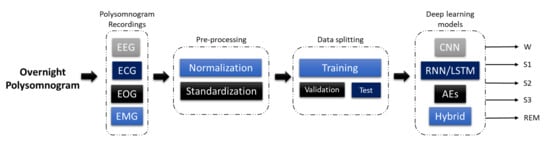The development of a program diagnostic tool (PDT) for automatic sleep stage classification using DL techniques is shown in Figure 6. First, PSG recordings have to be pre-processed to achieve standardization or normalization. Depending on the requirement and architecture of the proposed DL model, additional steps to convert the PSG recordings into the right input format is required; for example, converting one-dimensional (1D) signals into a two-dimensional (2D) format to train 2D-CNN models. Subsequently, the pre-processed signals are split into training, validation, and testing sets. The training set is used to train the model, the validation set is to fine-tune the model, and the testing set is used to evaluate the model’s performance. A well-trained model can accurately classify PSG recordings into the five sleep stages.