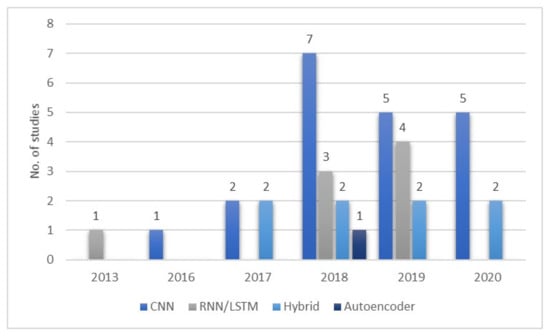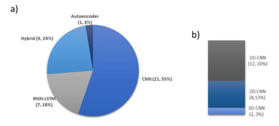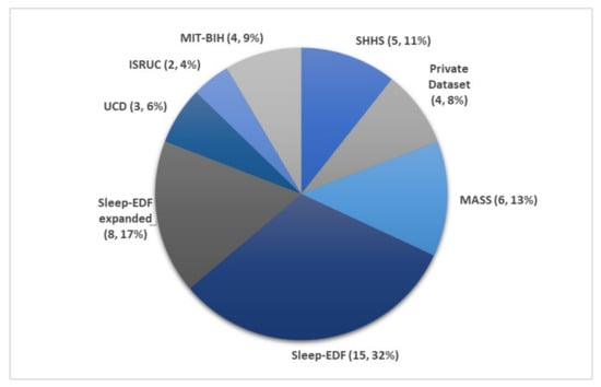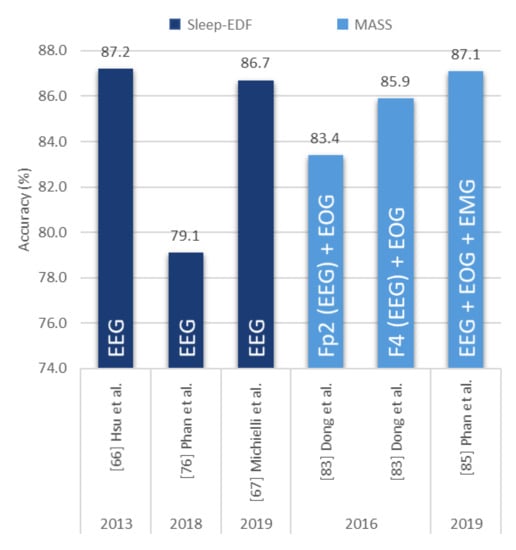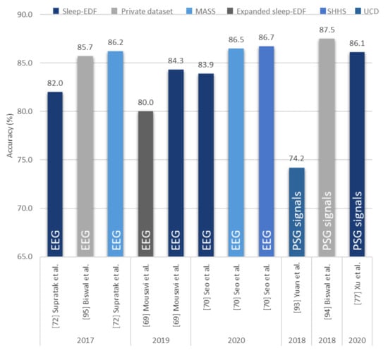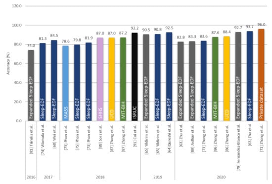 Figure 7 illustrates the number of times each sleep database had been used by studies for automated sleep stage classification using DL techniques, from 2010 to 2020. The DL methods and accuracy obtained from the respective sleep databases are summarized as follows: Sleep-EDF (Table 1), expanded Sleep-EDF (Table 2), MASS (Table 3), MIT-BIH, and SHHS (Table 4), and studies that used the remaining two sleep databases (ISRUC and UCD) and private datasets are listed in Table 5. With the exception of three studies [,,], which classified sleep into four stages, all automated sleep stage classification studies, in Table 1, Table 2, Table 3, Table 4 and Table 5, followed the AASM guidelines [] and classified sleep into five stages. In studies with sleep databases following the R and K rules [], (i.e., Sleep-EDF, expanded Sleep-EDF, UCD, SHHS, and MIT-BIH), the S3 and S4 stages were often combined manually before pre-processing the PSG signals.