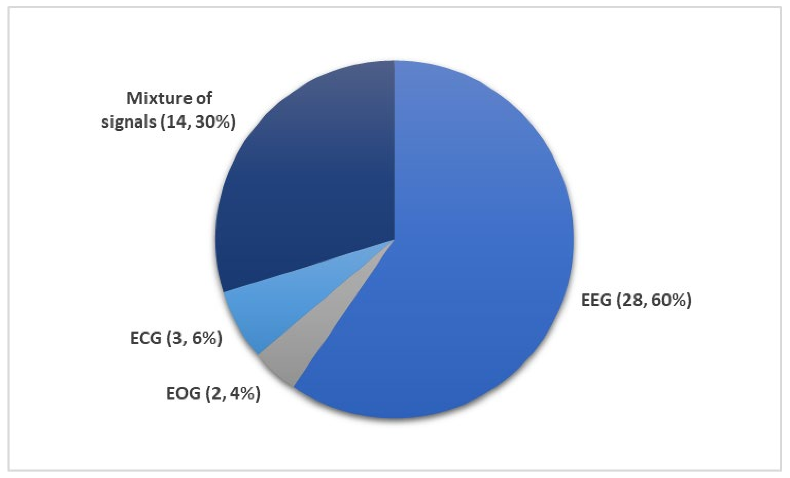 - Most studies (60% from Figure 8) used EEG signals and achieved high classification accuracy.