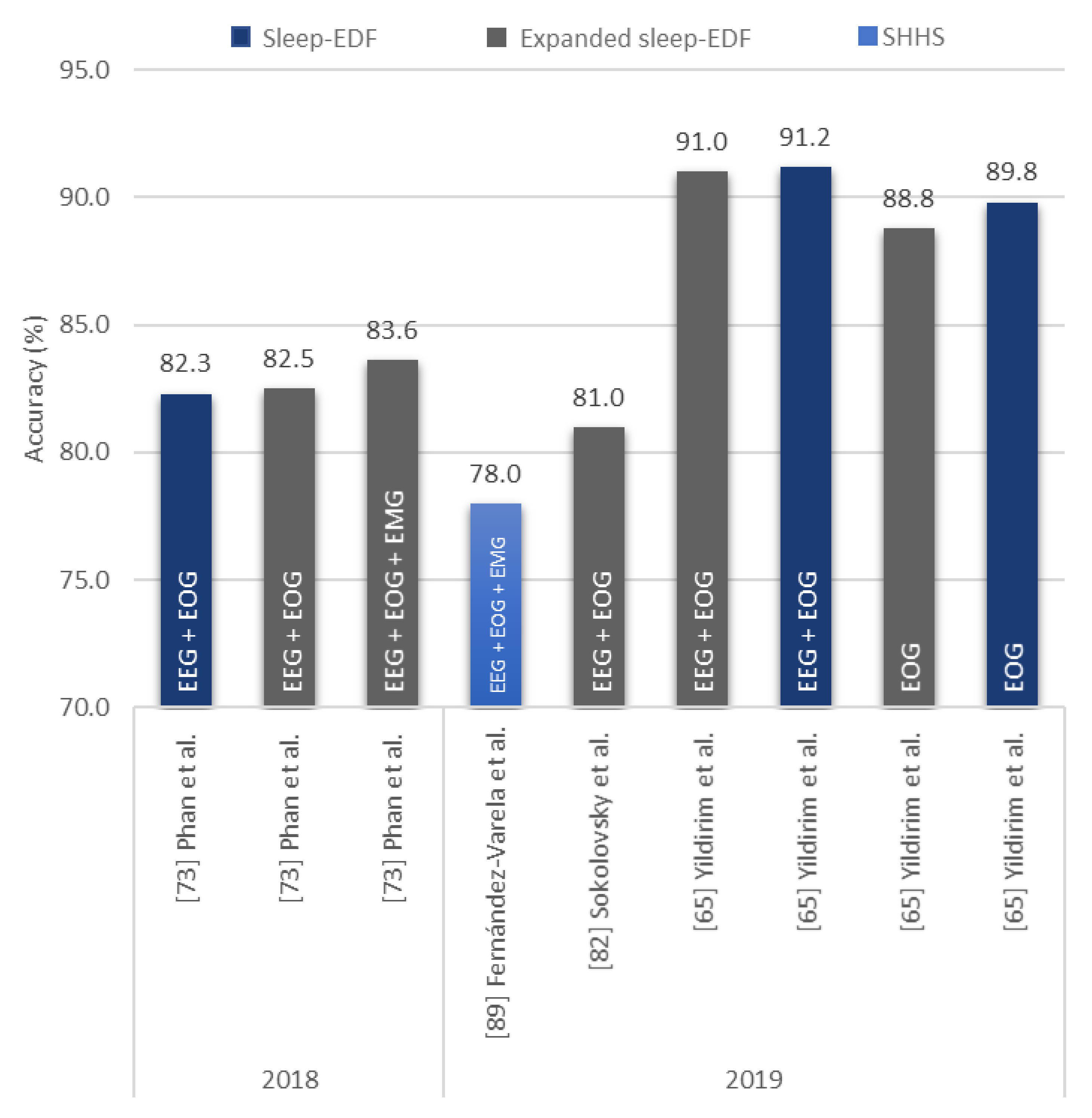 | Sokolovsky et al. [82] 2019 | EEG + EOG | − | CNN | TensorFlow + Keras | 81.0 |