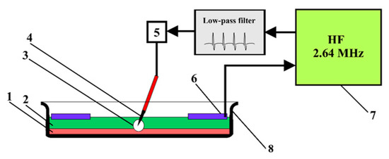 Schematic diagram of the experimental setup, showing (1) the stem cell culture, (2) layer of Ringer’s solution, (3) plasma discharge, (4) electrode applicator with a needle, (5) dispenser, (6) ring neutral electrode, (7) high-frequency generator and (8) Petri dish.