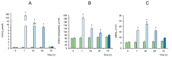 At the first stage, we studied the effect of LTP on the formation of reactive oxygen species in the incubation medium. Hydrogen peroxide is the most long-lived ROS form; therefore, we estimated the concentration of this compound. One can see from Figure 2A that LTP induced a dramatic increase in the concentration of hydrogen peroxide in the medium within 1 h after exposure (760-fold). Over the next 48 h, the concentration of hydrogen peroxide decreased by an order of magnitude. After 72 h, the concentration of hydrogen peroxide decreased to the control level. It is known that the overproduction of ROS stimulates oxidation processes, including lipid peroxidation, which is accompanied by the destruction of cell membranes and the damaging of macromolecules [34]. The LTP effects were also found to be accompanied by significant stimulation of the formation of lipid peroxidation products (diene conjugates and malondialdehyde). Within an hour after treatment, the concentration of LPO products increased by three times on average. Moreover, an increased concentration of LPO products was observed for another 48 h. By 72 h of incubation, the concentration of LPO products decreased to the control level (Figure 2B,C).