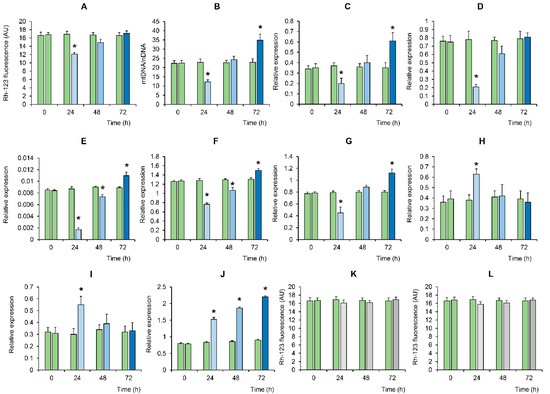 Time-dependent changes in mitochondrial potential, biogenesis and dynamics in the BMSC in response to LTP treatment (blue bars). Panels A and B show the effect of LTP on (A) the mitochondrial potential of BMSC, assessed by rhodamine-123 (Rh-123) fluorescence, and (B) the ratio of mtDNA to nDNA. A real-time quantitative polymerase chain reaction (qPCR) was carried out to determine the mtDNA copy numbers as a mitochondrial (ND1) to nuclear (globulin) ratio. Panels C–J show the effect of LTP on the relative expression (to β-actin (bAct) of the following genes: (C) PGC-1a; (D) DRP1; (E) OPA1; (F) MFN1; (G) MFN2; (H) PINK1; (I) Parkin; and (J) FIS1. Panels (L,K) show the effect of hydrogen peroxide (50 and 100 μM, respectively) on the mitochondrial potential of the BMSC in the absence of LTP treatment (grey bars). The green bars indicate no exposure to plasma. The values are given as means ± SEM (n = 3). * p < 0.05 compared to the control.