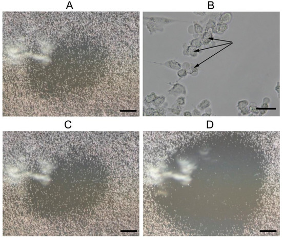 Micrographs of a BMSC culture 1 (A,B), 24 (C) and 36 (D) hours after exposure to LTP. Microphotographs were taken at the location of the needle electrode, on which the plasma formation process took place. The scale bars were 500 µM (A,C,D) and 40 µM (B). Black arrows indicate vesiculation of the cytoplasmic membrane.