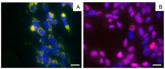 Micrographs of the BMSC culture before plasma treatment (A) and 24 h after exposure to LTP (B), obtained by an overlay of three fluorescent channels and transmitted light. Cytoplasm is colored green, viable cell nuclei are colored blue (Hoechst 33342) and a pink color (propidium iodide) indicates apoptotic cell nuclei. The scale bars are 20 µM.