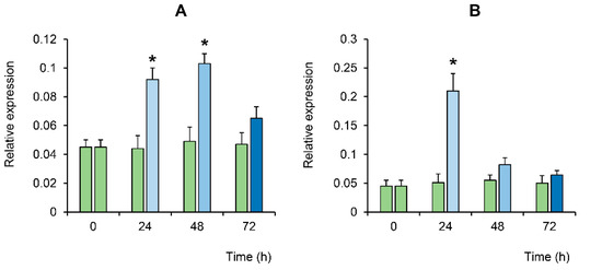 Changes in the relative expression of caspase 3 (A) and JNK (B) in the BMSC culture at different times after LTP exposure (relative to bAct, shown by the blue bars). The green bars indicate no exposure to plasma (i.e., the control). The values are given as means ± SEM (n = 3). * p < 0.05 compared to the control.