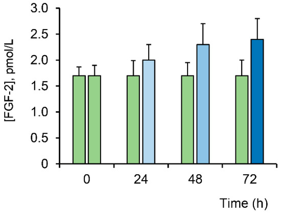 Evaluation of the fibroblast growth factor (FGFb) level in BMSC at different times after LTP exposure (blue bars). Data are represented as the means ± SEM (n = 3). The green bars indicate no exposure to plasma.