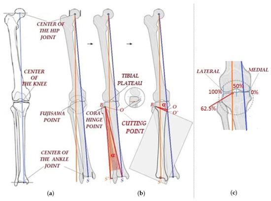 - Draw a line (orange) that passes through the center of the femoral head and through a point known in the scientific literature as the “FUJISAWA point” (Figure 1b) [19,21,22,23]. As can be observed from Figure 1b,c the Fujisawa point is a point positioned at 62.5% on the medial to lateral transverse knee line (hereinafter, “the FUJISAWA point”). The precise positioning of this point is still a controversial topic among specialists. It should normally be positioned halfway between the medial compartment and the lateral part (Figure 1c), but due to the predisposition of the affected patient to a continuous wear of the intra-articular cartilage, an overcorrection is preferred in the sense that the point is positioned at 62.5% of the distance. There is also the possibility that the surgeon chooses to set this point between 50 and 70%, depending on the degree of cartilage wear [21].