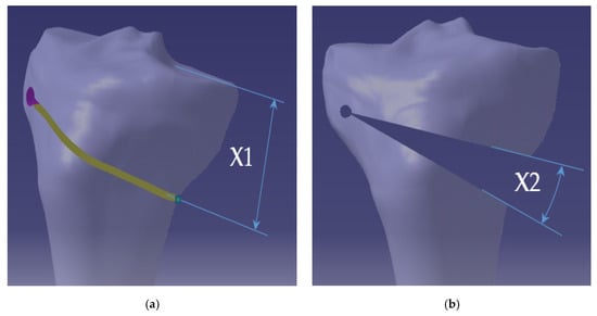 The purpose of the performed static analyses is to determine the state of stresses in the CORA area for the uniplane opening osteotomies, taking into account the studied parameteres, namely: X1—the position of the cutting point relative to the corresponding tibial plateau (Figure 2a) and X2—the value of the required correction angle (Figure 2b).