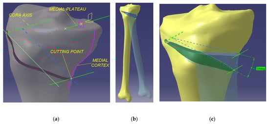 The relevant elements were positioned on the tibial model (Figure 3a): CORA axis, medial cortex, and the cutting point. We note that, during the modelling, the cutting point was constrained so as to permanently coincide with the medial cortex and so its position can be defined relative to the tibial plateau (30, 40, 50 mm in our study). Additionally, we note that the line (depicted in blue in Figure 3a) that started from the cutting point and was perpendicular on the CORA axis defined, together with the CORA axis, the osteotomy plane.
