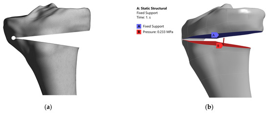 Figure 4a shows the model meshed for a cutting point located at 30 mm from the tibial plateau and a correction angle of 14 degrees. The method of applying the necessary stresses and constraints on the model (Figure 4b) considers the angular removal of the two sides of the osteotomy cut in order to achieve the osteotomy wedge at the desired correction angle. In this regard, a fixed constraint was considered, located on the side facing the joint, while the other face was subjected to a uniformly distributed stress.