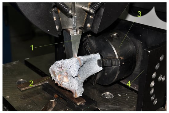 Figure 7 shows a detailed image of the stand with the prismatic spacer 1 inserted into the tibia 2 fixed in the self-centering device 3. The “U” type frame 4 ensured the correct orientation of the tibia relative to the prismatic spacer.