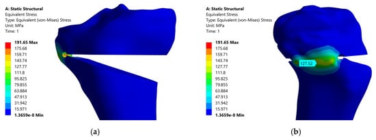 Equivalent von Mises stress in the CORA area—for X1 = 30 mm, X2 = 14 degrees, the inner surface (a) and the outer surface (b).