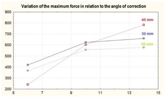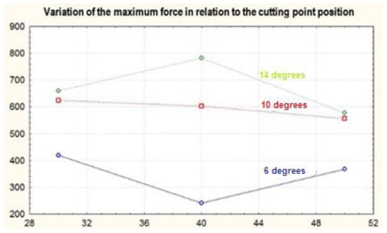 Reverting to our analysys, as resulted from Figure 11, for the 6 degree angle, the highest value of the maximum force was obtained in the scenario in which the cutting point was positioned at 30 mm, followed by the force obtained in the scenario in which the cutting point was positioned at 50 mm, whereas the least favorable value was that of 40 mm.