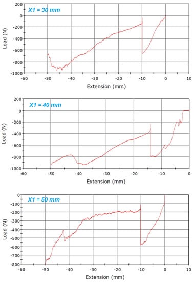 In the experimental study, the correction angulation was achieved for the three positions of the cutting point (30 mm, 40 mm, 50 mm). For this approach, the optimal value of the combination of parameters was dependent on the highest obtained value of the maximum force, i.e., the force for which the first microcracks appearred in the CORA area.