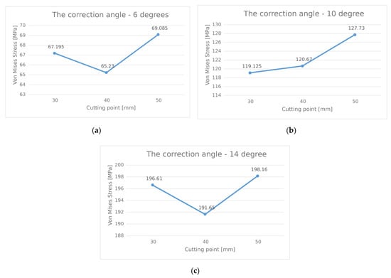 It can be observed that, for small correction angles, e.g., 6 degrees, there were only minor differences between the values of the von Mises stresses. The lowest value of the von Mises stress was recorded for the scenario in which the cutting point was positioned at 40 mm. The value registered for the 30 mm scenario was also a convenient one, as the difference in stresses in the two scenarios (40 mm and 30 mm, respectively) was only 1.965 MPa.