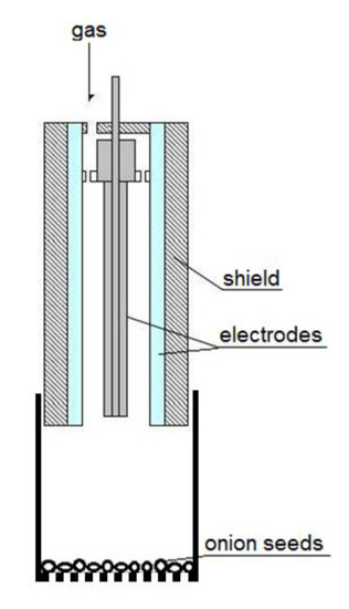 Tested material were Wolska seeds (Allium cepa L.) purchased at Przedsiębiorstwo Nasiennictwa Ogrodniczego i Szkółkarstwa PNOS, Ożarów Mazowiecki (Poland). They were exposed to afterglow plasma gas. Plasma was generated in the radio frequency jet reactor (Figure 1). The plasma jet was excited by an AG 1021 RF generator (T&C Power Conversion, Rochester, NY, USA) with integrated amplifier and meter of forward and reflected power. In order to increase the voltage between electrodes (sinusoidal signal of 890 V RMS), an air transformer (1:12 winding ratio) was used with parallel connected capacitor for impedance matching. Load power was set to 45 W (forward power 47 W) with frequency of 14.16 MHz. Plasma was generated in the discharge gap between an external tubular-shaped electrode made of stainless steel (14 mm diameter) and internal tungsten rod-type electrode (5 mm diameter) [13]. Substrate gas was a mixture of He + N2 (ratio 3:2) at total flow rate of 710 L/h. For the gas dosing, glass tube variable area flow meters (Zakłady Automatyki “ROTAMETR”, Gliwice, Poland) were used. One layer of seeds was placed on the movable strainer located in the glass container (60 mm in diameter and 60 mm length). The distance between the nozzle’s outlet and surface of the sample was 20 mm (for treatment times up to 15 s) or 50 mm. The energy density inside the RF plasma reactor was quite high, ranging to 230 kJ/m3. It is difficult to calculate directly the power transferred to the seeds as they were placed at selected distance from the nozzle, in the afterglow area. Direct gross power calculation result was around 7 W forwarded power per 1 g of seeds.