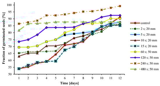 An important trait of seed material is its ability to germinate quickly and to produce healthy sprouts in a specified time. The dynamics of the plasma-treated onion seeds germination process is presented in Figure 3 and Table 2.