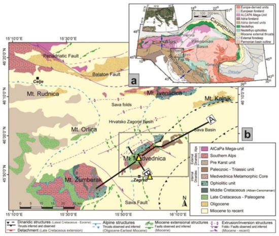 - van Gelder, I.E.; Matenco, L.; Willingshofer, E.; Tomljenović, B.; Andriessen, P.A.M.; Ducea, M.N.; Beniest, A.; Gruić, A. The tectonic evolution of a critical segment of the Dinarides-Alps connection: Kinematic and geochronological inferences from the Medvednica Mountains, NE Croatia. Tectonics 2015, 34, 1952–1978. [Google Scholar] [CrossRef]