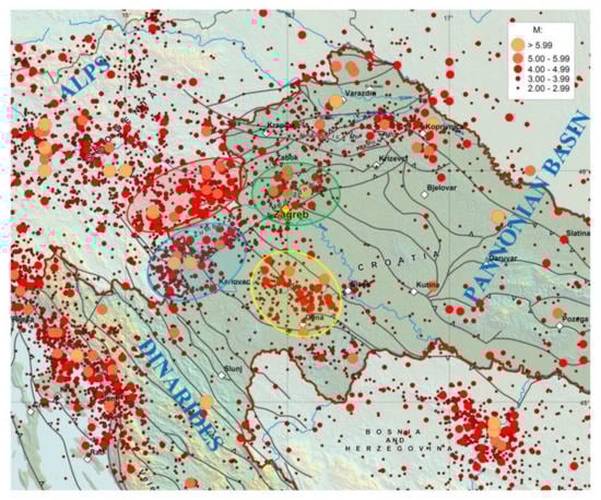- Kuk, V.; Prelogović, E.; Sović, I.; Kuk, K.; Šariri, K. Seismological and seismo-tectonical properties of the wider Zagreb area. Građevinar 2000, 52, 647–653. Zagreb (In Croatian) [Google Scholar]