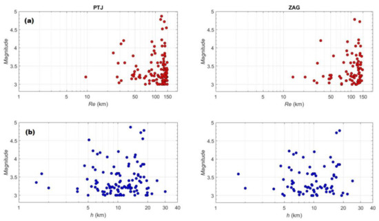 Two seismological stations included in this study are: Puntijarka (PTJ), located at the top of Medvednica Mountains and Zagreb (ZAG), located in the city area (Figure 1). A compiled ground motion data set is selected within ML ≥ 3.0, Re ≤ 150 km and a focal depth of h ≤ 30 km. Figure 3 evaluates the compiled ground motion dataset distribution of the epicentres (Re) and focal depth with magnitudes (ML) at each station. The number of recordings at each station depends not only on local seismicity and data selection that is the same for both stations, but also on the operational period of each station (from 2000) and usable frequency sampling rate. In this study we used 50 Hz seismograms recorded from 2004 to 2019 (PTJ, 127 recordings) and from 2007 to 2019 (ZAG, 92 recordings).
