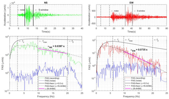 We applied Anderson and Hough’s [5] well-known method (AH84) for estimating κ by analysing the S-wave spectra in this study following Ktenidou et al. [7,11] guidelines. The total path attenuation of S-waves within the crust is separated into two attenuation parameters: the frequency-dependent quality factor Q(f) and the near-surface attenuation parameter κ (also termed site diminution parameter, κ0) as shown in Equation (1) where A(f,t) is acceleration spectrum that contains the effects of source, distance and local site effects. In Equation (1), t* is attenuation time [4], f is frequency, R is distance, β0 is shear wave velocity of the Earth’s medium: