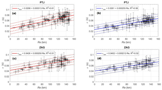 Least-square linear regression of and Re data pairs. PTJ station: (a) horizontal model, (b) vertical model. ZAG station: (c) horizontal model, (d) vertical model. Fit regression line shown by thick lines. ±1 standard deviation-dashed lines. ±2 standard deviation-dotted lines. Vertical error-bars show the uncertainty of κ values and horizontal error-bars show uncertainty in epicentral distances with standard error set to ± 5 km.