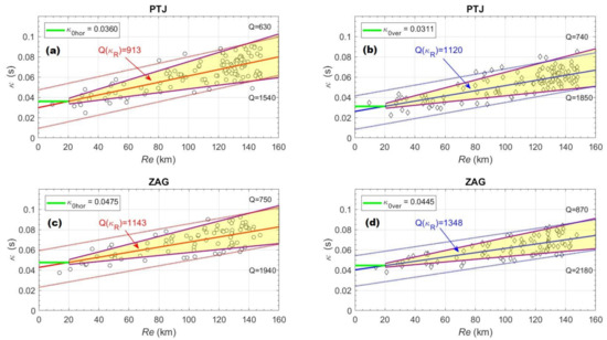 Comparison of results from different methods to estimate κ0. PTJ station: (a) horizontal model, (b) vertical model. ZAG station: (c) horizontal model, (d) vertical model. Thick green line indicates constrained κ0 value at shorter distances. Zero-distance regression line indicate the κ0 value estimated from Figure 5. Yellow range shows Q models for different slopes applied within ±2 standard deviations (dotted lines) at larger epicentral distances for a fixed κ0 value.