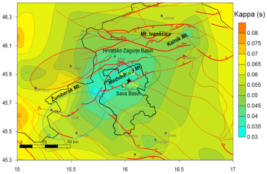 If we take a look at the gradual increase of with distance from the stations, the regional path effect from the source attributed to the is described by the slope regression . It can be observed that the spatial distribution is not isotropic and different trends between estimated lower and higher attenuation of ground motion subsets are observed. According to [1], the source of anisotropy is most likely attributed to orientations of the cracks and fractures under the local tectonic stress field, waveguides along major faults and attenuation within fault zones, S-wave reflections from different parts of the shallower Moho discontinuity. Variations in observed distribution between lower and higher attenuation subset areas is clearly under influence of local and regional geological structures; to the north influenced by the Ivanščica Mt. and Kalnik Mt., to the south by Žumberak Mt., and in its centre by the Medvednica Mountains, that are distributed predominantly within regional active faults ([19], Figure 1) and main seismic zones (Figure 2). We limit spatial distribution of κ (Figure 7) within distance of 80–100 km from Zagreb area to avoid additional path complications, since ground motion ray paths from source to station show a wider range of Q (Figure 6, [37]), and to derive conclusions within seismic zones Novo Mesto-Krško, Karlovac-Metlika and Pokupsko-Petrinja (Figure 2), that influence seismic hazard of the Zagreb city area.