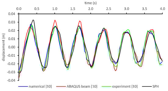 The displacement history of the free vibration at the midpoint of the cable is given in Figure 4. In the figure, the experimental and numerical data in [9] and the present numerical results labeled as SPH are shown. The first peak is slightly overestimated by the SPH method. Other peaks are predicted satisfactorily.