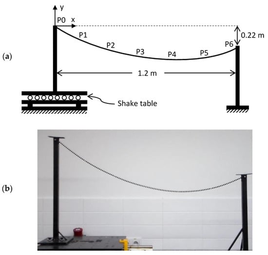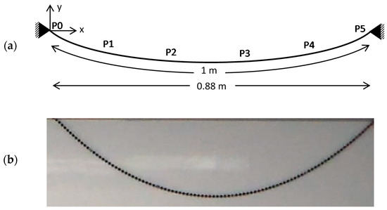 This experiment is inspired by the experiments available in the literature. It was first presented by [47], used in [48] and repeated in the study of [49]. It is a basic experiment for the investigation of dynamic motion of cables. In the previous versions of this experiment, the cable was released from the support of a catenary position defined in Figure 5 and the dynamic motion of it was supplied via camera. Snapshots from a camera were given. No additional numerical data were presented.