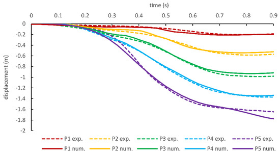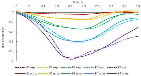 Figure 6 and Figure 7 show the displacement of intermediate points and the free end. The simulated displacements of intermediate points are close to the experimental data. However, the displacement of the free end is slightly overestimated in SPH. The reason for this slight difference is the particle approximation and kernel integration errors at the free end of the cable.