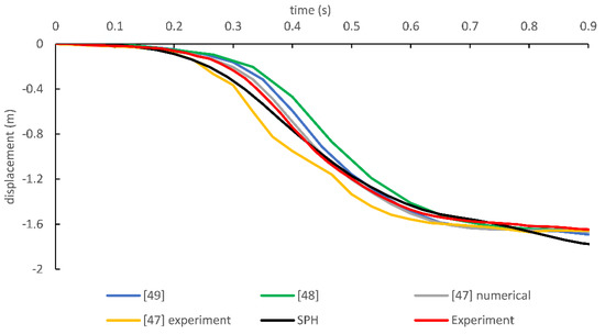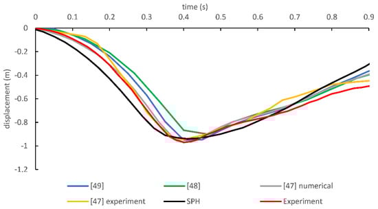 Displacement of P5 (free-end) is compared with the literature data in Figure 8 and Figure 9 (comparison of displacement of intermediate points is not possible due to the lack of reproducibility of previous studies). As mentioned above, time intervals were not clearly stated for the experiments available in the literature, thus numerical data were compared qualitatively. Previous numerical data available in the literature are scaled with respect to time based on the experiment carried out in this study for a quantitative comparison. It should be mentioned that scale factor is constant for each study. According to the figure, it can be said that SPH can predict the dynamic motion of the cable reasonably well.