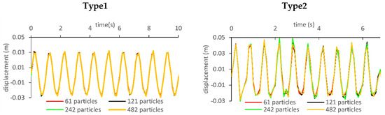 The displacement in y direction of P3 was used for convergence analysis. The number of particles was defined as being 2 times the number of spherical weights and half of it. Analyses were repeated for both motion types as seen in Figure 11. Although no significant difference is observed for different numbers of particles for Type1, a noise is seen at about 2.5 s and 4.5 s for Type2. The noise exists for a greater number of particles (121 and 242). Nevertheless, a further analysis was carried out by increasing the number of particles (482). This same noise still occurs, so the number of particles is enough for the convergence analysis. For a greater number of particles, some particles in numerical analysis were in a position where no mass was defined in the experimental setup. Nevertheless, convergence parameter shows similar results for a greater number of particles than 61. In all the simulations, the number of 121 particles was preferred, because each spherical weight in the experiments was represented by an SPH particle.