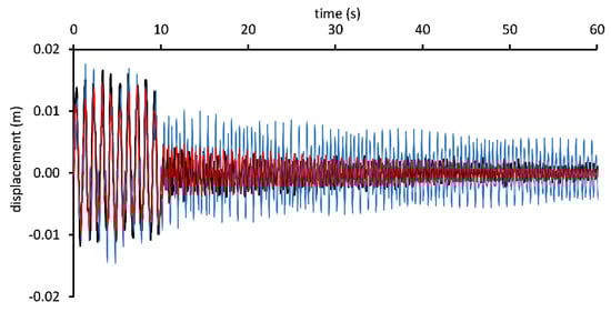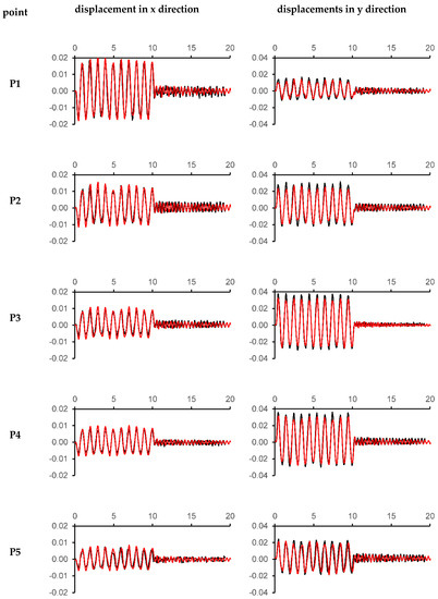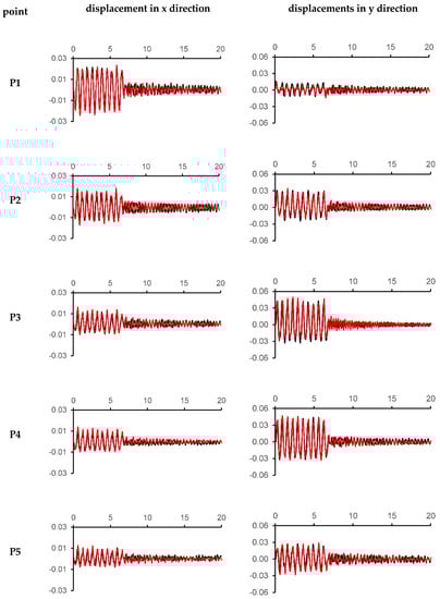 The simulated and measured displacement history of the defined points can be seen in Figure 12 and Figure 13 for Type1 and Type2, respectively. In the figures, black and red continuous lines show the experimental and numerical data, respectively. Due to the harmonic excitations, the cable started to displace. The simulated excitation-driven motion of the cable perfectly matches with the experimental data in terms of the period and amplitude.