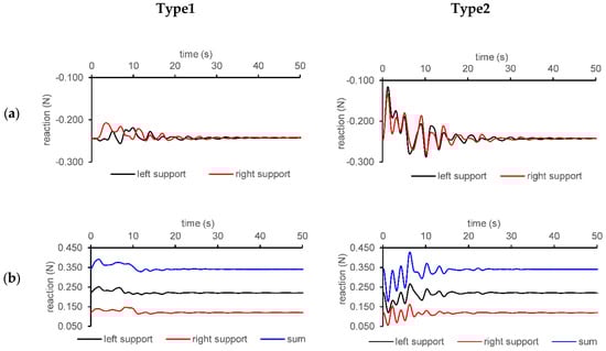 Time history of magnitudes of reactions on supports in (a) x and (b) y direction.
